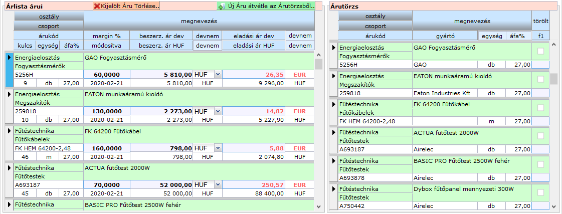 Ekkor a kijelölt áru eltűnik az árutörzs listából és a bal oldali árlista árui közt jelenik meg.