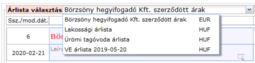 A már létrehozott árlistáinkat űrlap tetején, bal oldalon találjuk. A legördülő lista értékkészletében választhatunk ki egy árlistát. Az űrlap betöltődésekor automatikusan az utoljára létrehozott árlista már ki van választva.