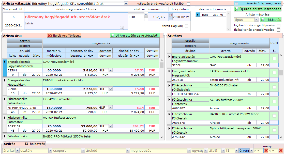 • bal oldalon az árlista áruinak listája, tehát azon árucikkek, amiket már felvettünk az árlistára