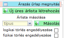 A fejléc jobb szekciójában található az árlistákra vonatkozó alapvető műveleti gombok és más kezelőszervek.