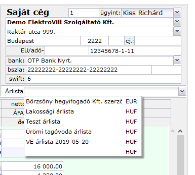 Az árlistát kiválasztani, módosítani illetve eltávolítani a bizonylat fejlécében, annak jobb oldalán a saját cégünk adatai alatti legördülő listában tudjuk.