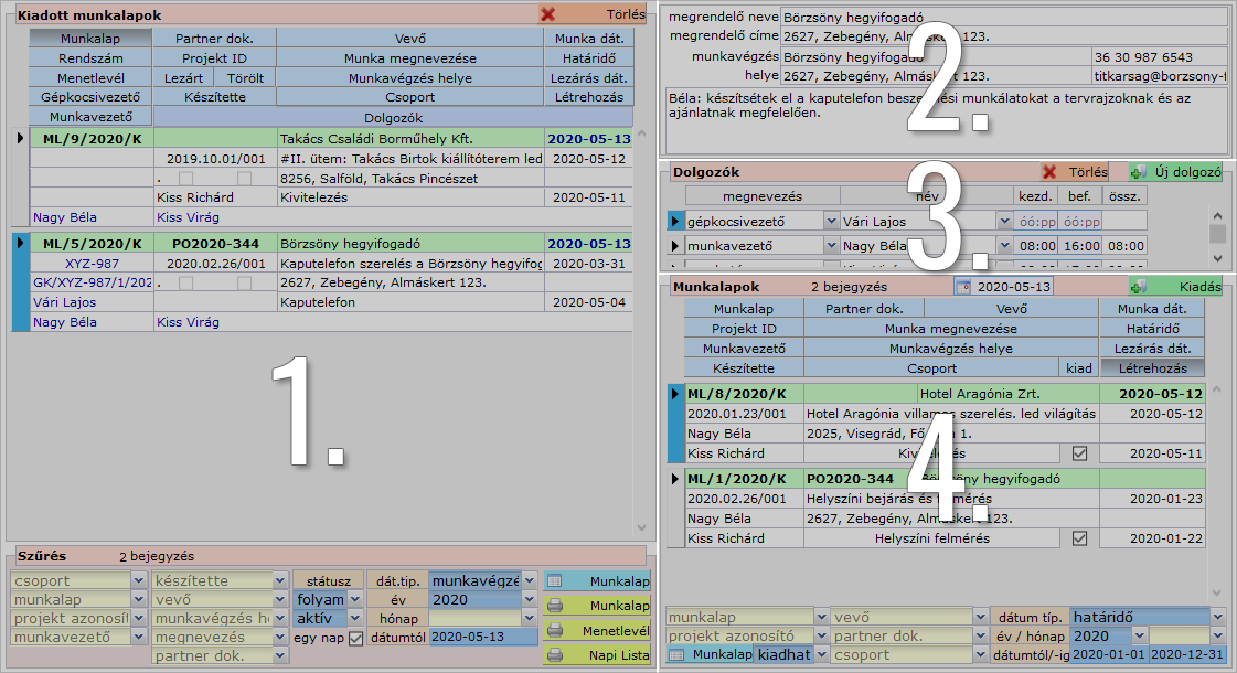 A bal oldali panel szokásos, alsó szekciójában találjuk a szűrőt, amivel a már kiadott munkalapokat listázhatjuk ki különféle kritériumok alapján. A szűrőben az alábbi feltételek állíthatók be: