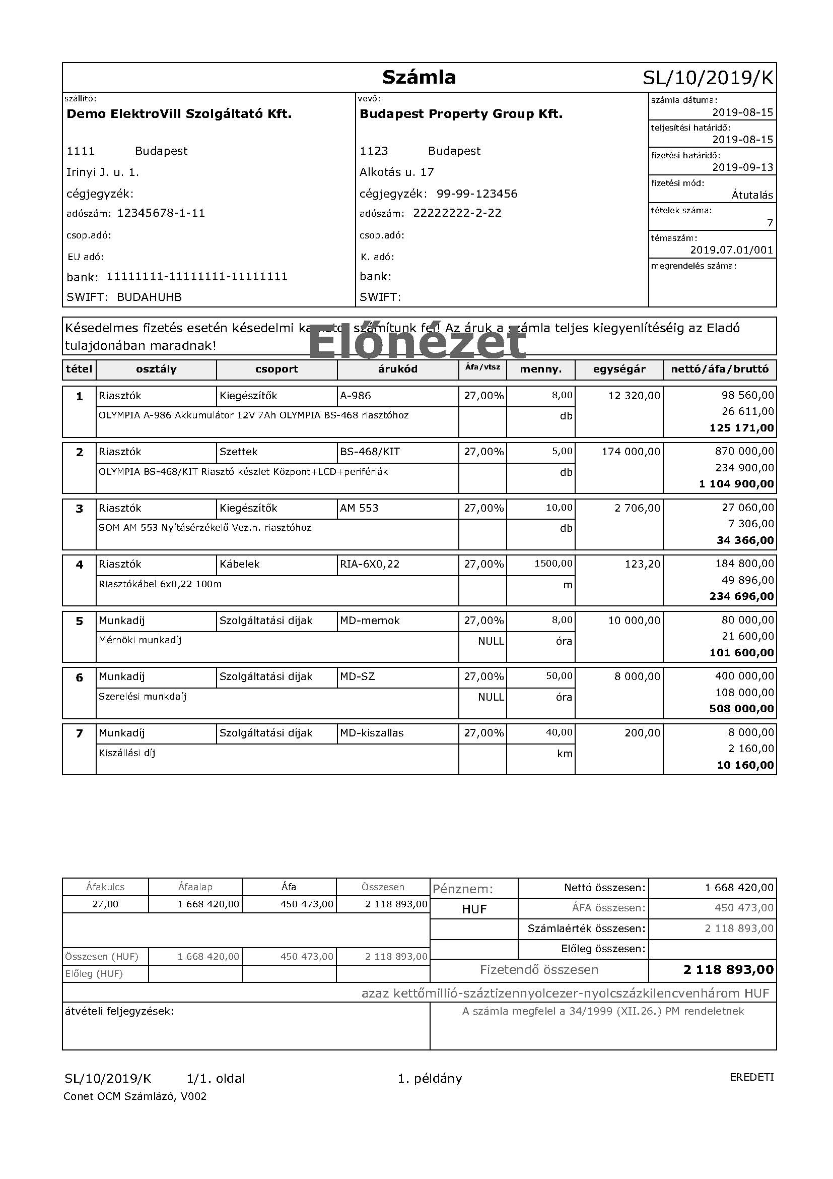 Az így készített dokumentumot menthetjük PDF állományként vagy akár papírhordozóra is nyomtathatjuk. Számviteli értelemben a bizonylat érvénytelen, azonban meggyőződhetünk róla, hogy a bizonylatunkon minden szerepel-e.