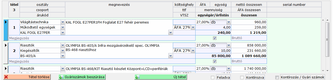 - A Bizonylat részletei űrlapon manuálisan soronként megszerkesztve