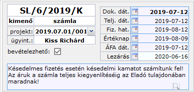 - Bizonylat sorszáma: Az adott típuson és irányon belül a következő sorszám, ami a bizonylatot egyértelműen azonosítja, ami nem szerkeszthető adat. A sorszám formátuma: XX/sorszám/év/irány, ahol az XX a dokumentum típusa (pl. SL = számla), az irány B = bejövő, K = kimenő.