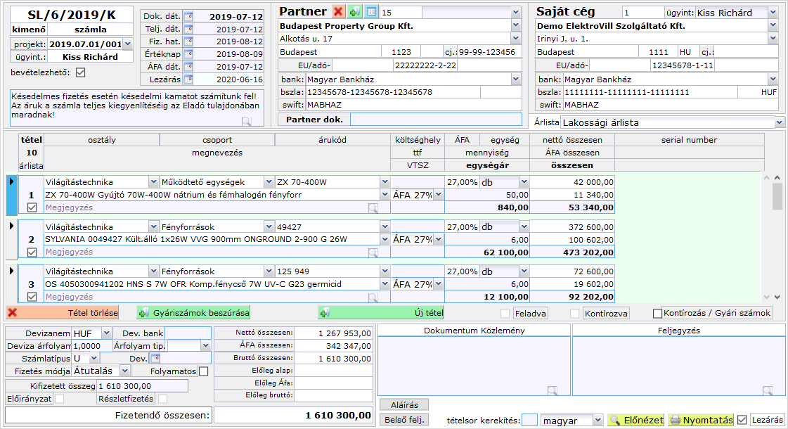 Egy már korábban létrehozott, kitöltött bizonylat esetén a kezelőfelület így néz ki: