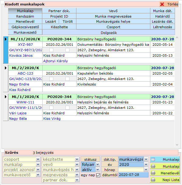 A mostani példában 2020. első félévéig kiadott összes munkalapot szeretnénk listára helyezni, beleértve a a már lezárt és folyamatban lévőket is, de csak az érvényes munkalapokat, a törölteket nem.