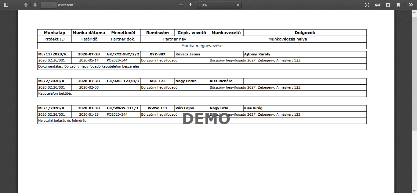 A három munkalaphoz 3 gépjármű menetlevél kapcsolódik és mindhárom munkalap esetében más a munkavezető, a munkatársak és a gépjárművezető.