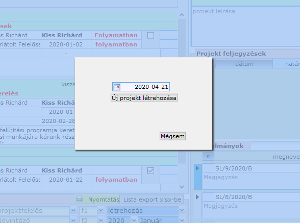 Az űrlap jobb oldalán a betekintő tábla mezőinek többsége üres lesz ekkor, kivéve a projekt azonosítót, amit a választott dátumból generált a rendszer, valamint a projektfelelős neve automatikusan a létrehozó személye lesz.