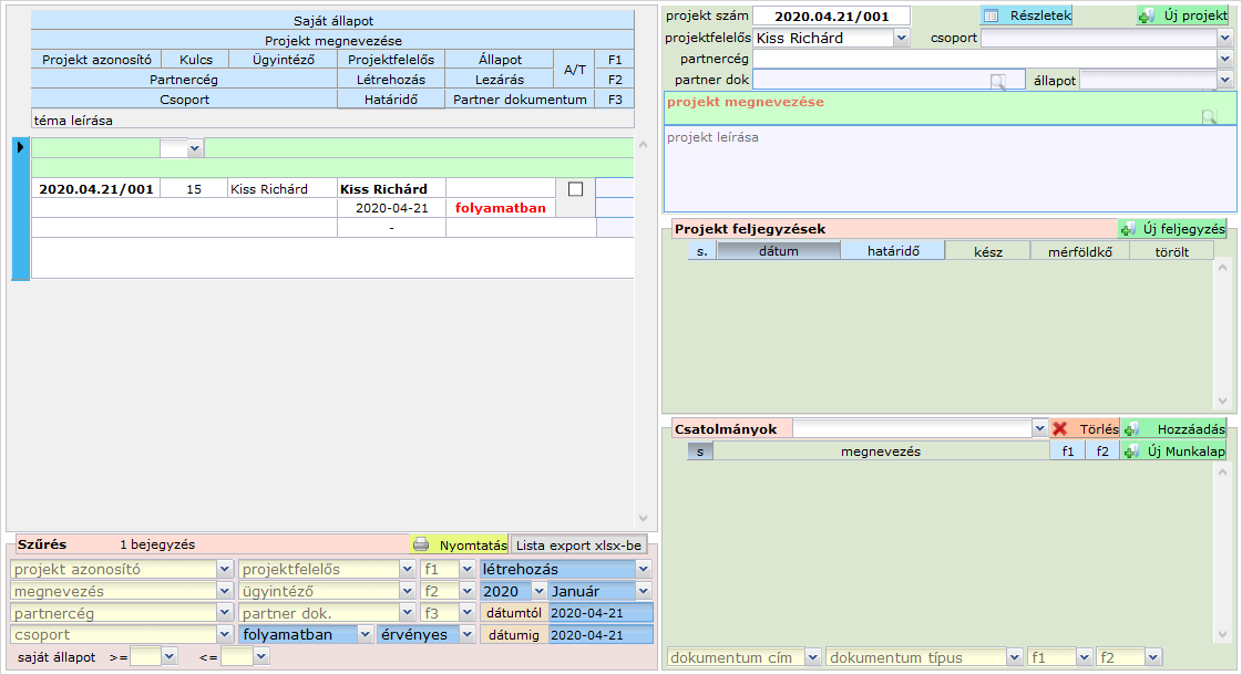 Ennek megfelelően az űrlap megnyitásakor az ezen kritériumoknak megfelelő projektek jelennek meg a listában. A demo rendszerben néhány mintaként elkészített projektet találunk ott, egy éles rendszer megigénylése pillanatában a lista üres.
