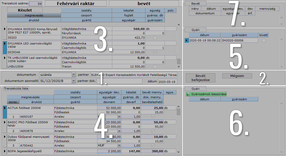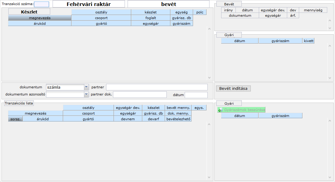 A bal felső panelen látni fogjuk a megnőtt készletmennyiségeket, a jobb felső tranzakciós tételeknél az éppen elvégzett bevételezés részletes adatait, valamint gyári számos tételek esetén az 5-ös számmal jelzett panelen a gyári számokat is látjuk.