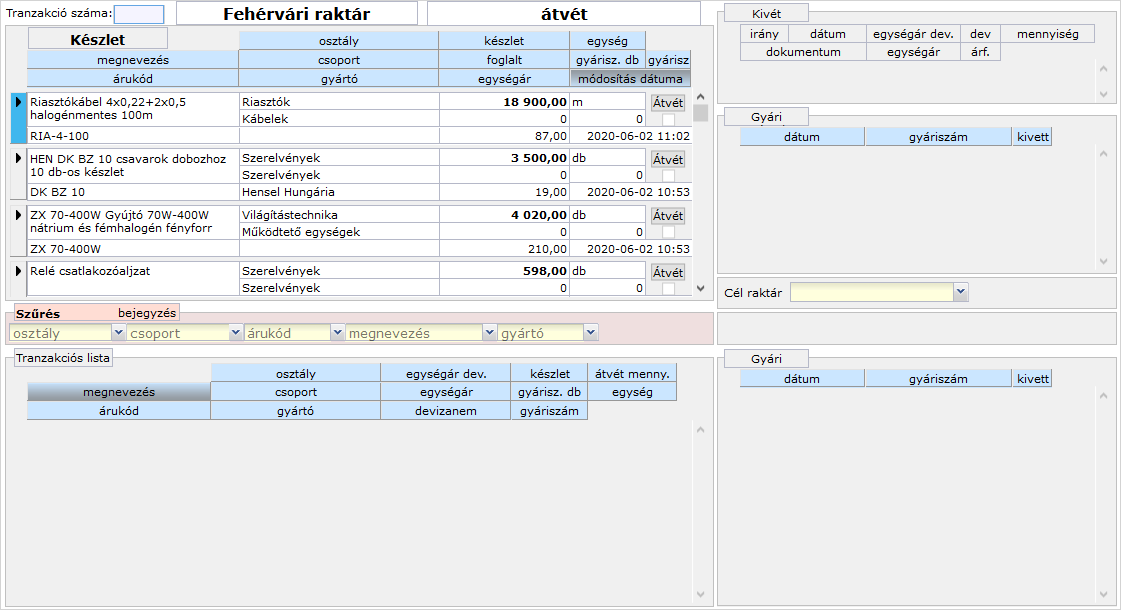 Ha egy áru sorában az Átvét gombra kattintunk, a készletlistából eltűnik az áru, a bal alsó tranzakciós listában pedig megjelenik.